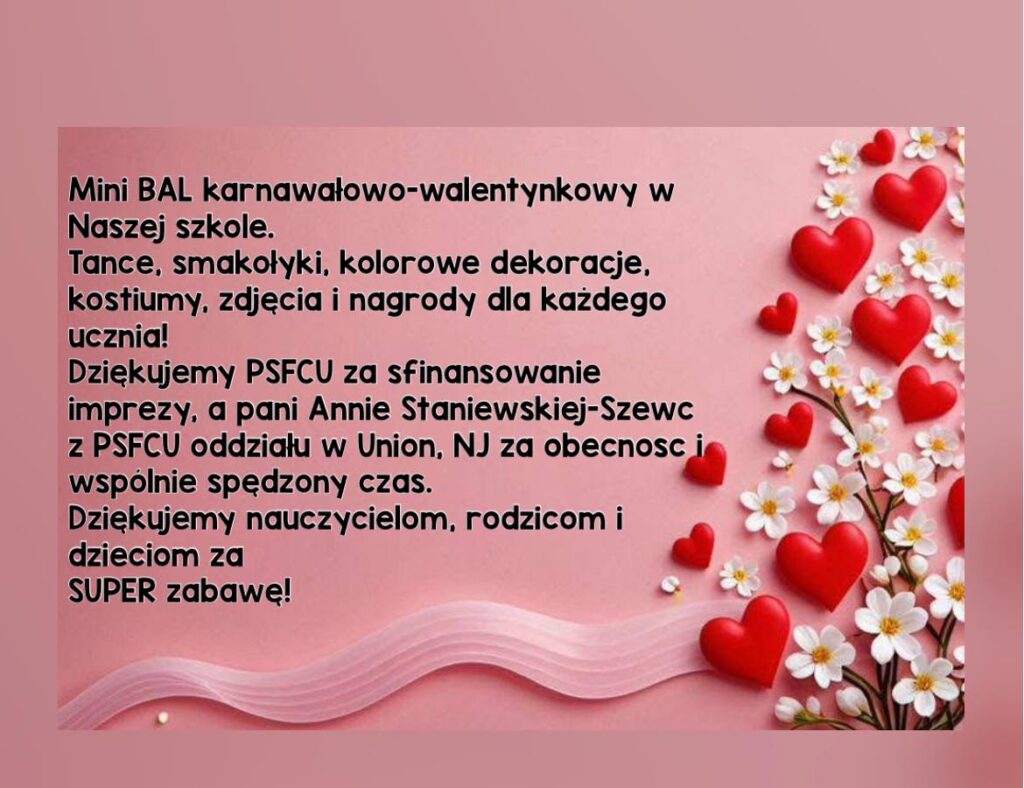 Serdecznie dziękujemy PSFCU za sfinansowanie balu Karnawałowo-Walentynkowego w naszej szkole. Pani Annie Staniewskiej-Szewc z oddziału w Union, NJ dziękujemy za obecność, wspólnie spędzony czas i radosną atmosferę tego wyjątkowego wydarzenia.
